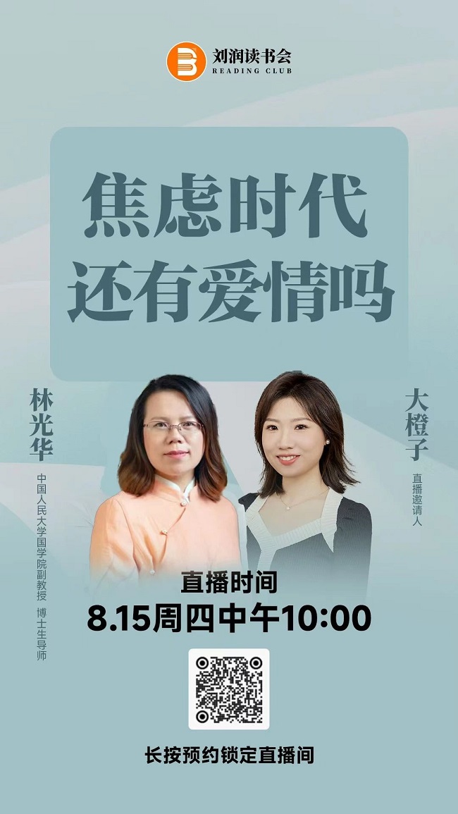8月15日上午10点,林光华老师将作课刘润读书会视频号直播间,分享焦虑时代下的爱情观念,“能为准备踏上这条道路、已在路中行走或跌倒的人提供一根拐杖,以便稳住心神,少走弯路,跌倒了也能爬起来。”