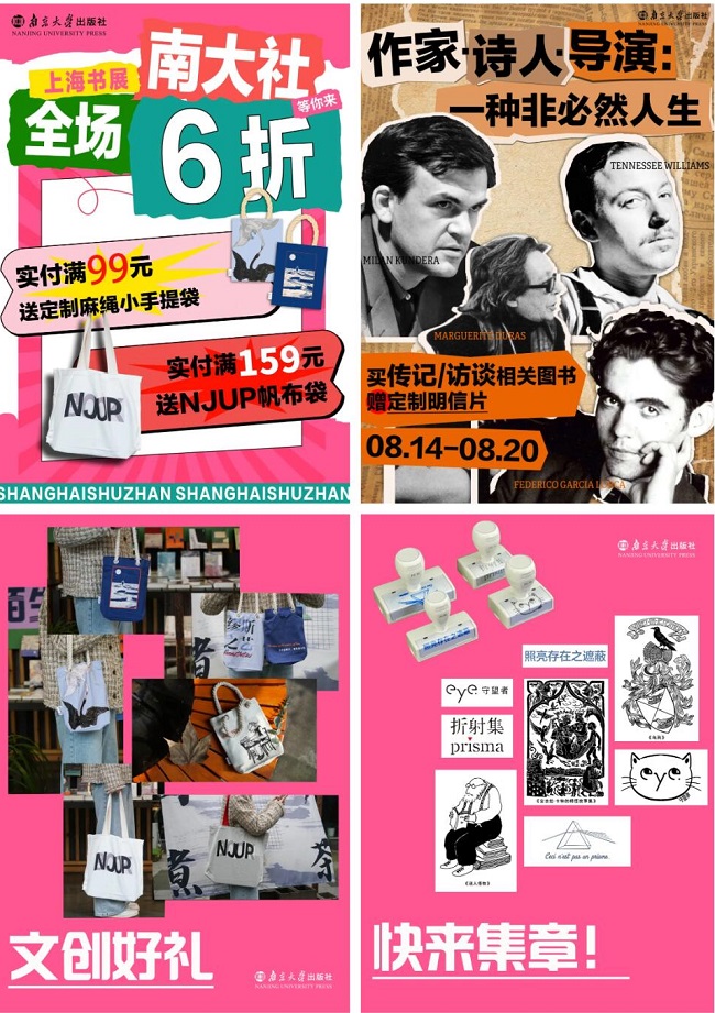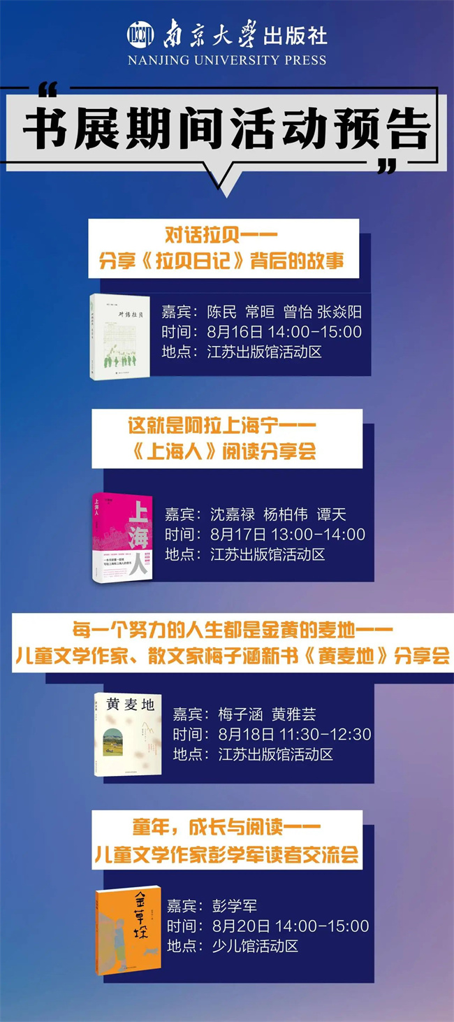 此次上海书展,江苏省将作为主宾省参展。南京大学出版社的展区位于中央大厅·江苏出版馆。南京大学出版社将携千余册好书和花样文创与读者见面,除了诚意满满的众多购书福利,还有4场重磅活动。