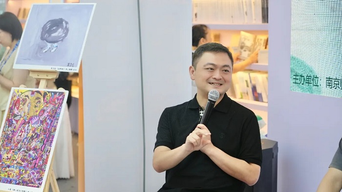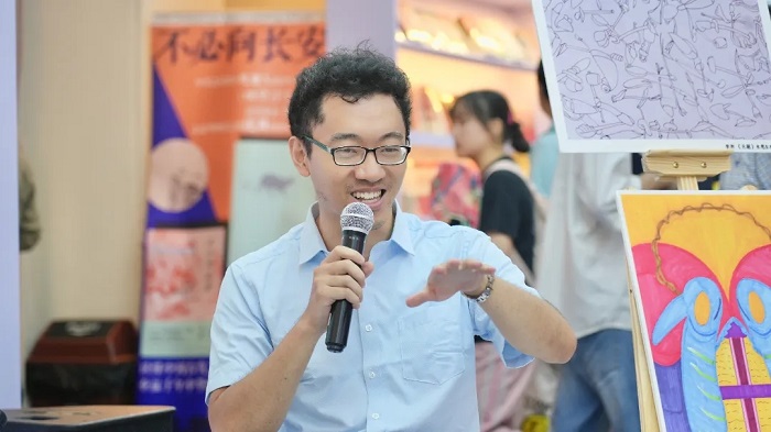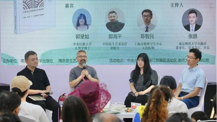 现场摆放的多幅原生艺术作品在活动开始前便引起观众热议。本次《重现:从原生艺术到原生艺术治疗》新书分享会暨原生艺术作品展,以“看见生命”为主题,由南京师范大学出版社主办。本书作者中国原生艺术治疗创始人、“原生艺术丛书”主编、南京原生艺术中心负责人郭海平先生,及中央民族大学人类学博士研究生郭呈如女士莅临书展现场,上海精神卫生中心主治医生暨“600号画廊”联合创办人陈智民先生也受邀坐客新书分享会,三位嘉宾在分享会上畅聊原生艺术,探讨艺术与精神健康的密切关联。