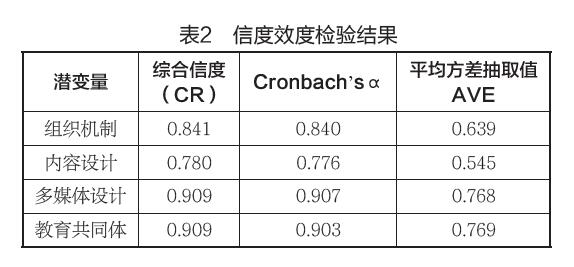 本研究对内容设计、多媒体设计与教育出版共同体3个题项进行同样操作。在初始量表中,测量内容设计的题项有6个,信度分析显示该题项整体的Cronbach’s α系数为0.701。其中代码为NR2的题项的CITC系数为0.144,小于0.4,如果剔除该题项,整体的信度系数将上升,因此本研究删除该题项,其他5个题项全部保留。测量多媒体设计的题项有3个,信度分析显示该题项整体的Cronbach’sα系数为0.816。所有题项的CITC系数均高于0.4,如果剔除任一题项,整体的信度系数会有不同程度的下降,因此多媒体设计的3个题项全部保留。教育出版共同体经分析,题项也全部保留。