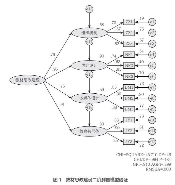 本研究利用另一半118份问卷进行验证性因子分析。验证性因子分析显示各题项相应的临界比C.R.值均高于临界值1.96,并且在P<0.001水平上显著。从拟合适配指数分析,卡方/自由度数值是0.994,显著性概率值P值为0.484,大于0.05,接受虚无假设,即假设模型图与观测数据适配;GFI=0.940,AGFI=0.899,RMSEA=0.000,参照结构方程关于模型适配度统计量的标准,可以判定教材思政二阶测量模型整体适配合理。