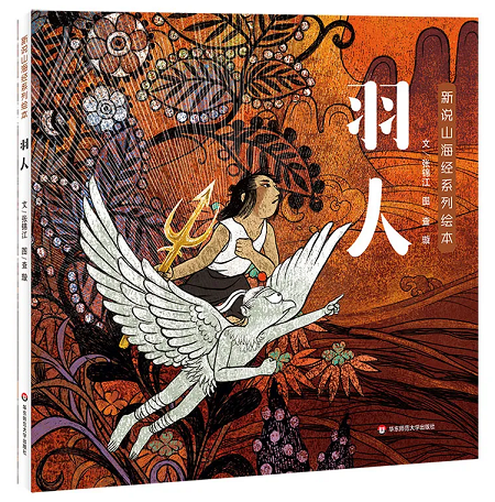 《羽人》故事文本源自《新说山海经(精怪卷)》中的一篇。一位身强力壮的渔夫张宏遭遇海浪袭击,不小心被冲到一个荒芜人烟的朱木岛上,在鸟神的救助下,渔夫重获新生。他在荒岛上自力更生,可是依然因为思念家乡而倍感寂寞。一天渔夫在海边抓鱼时救助了一个飘在海面上的、长着两个翅膀的羽人,谁料他竟然是羽人国的国王,因为受到鸭嘴妖的迫害不幸坠落在海面上,张宏毅然决定帮助羽王重新夺回王位,将羽人们成功救出之后,渔夫张宏也在他们的帮助下,顺利飞跃汪洋大海,回到了自己的家乡。插图采用绚烂的色彩表现上古社会的瑰丽、梦幻,很好地表达出这个故事的神秘感和传奇性。