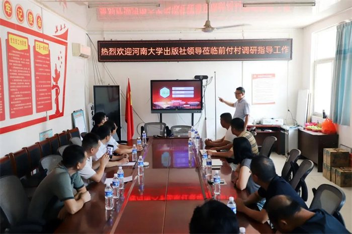 吴涛首先对河南大学出版社一行同志到来表示热烈欢迎,并从村庄基本情况、主要工作成效和工作开展情况三个方面详细介绍了前付村的基本情况和工作成效,生动展示出在一届届驻村书记(工作队)的带领下,乡村产业快速发展,人居环境明显改善,文明幸福指数显著提升,全村精神风貌焕然一新,乡村基层治理能力显著增强的新局面。