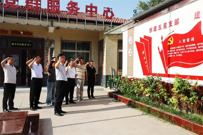 座谈会结束后,河南大学出版社与前付村联合开展主题党日活动,全体党员重温入党誓词,重忆入党初心,并合影留念。