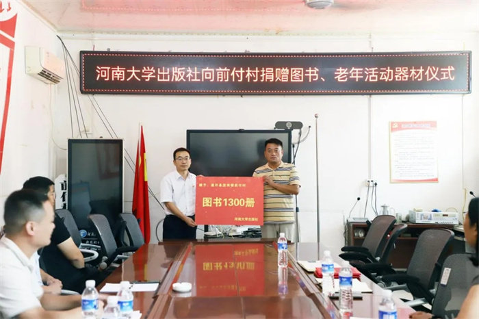 本次河南大学出版社向前付村捐赠了价值约54000元的图书1300册及价值约10000元的老年活动中心桌椅器材。在进行了简短而隆重的捐赠仪式之后,杨光辉一行实地参观了崭新的老年活动中心和图书阅览室等活动场所。村民代表对河南大学出版社的慷慨捐赠表示感谢,图书和活动器材将不断丰富村民的文化生活,满足群众精神文化需求,推动农村精神文明建设全面健康发展。