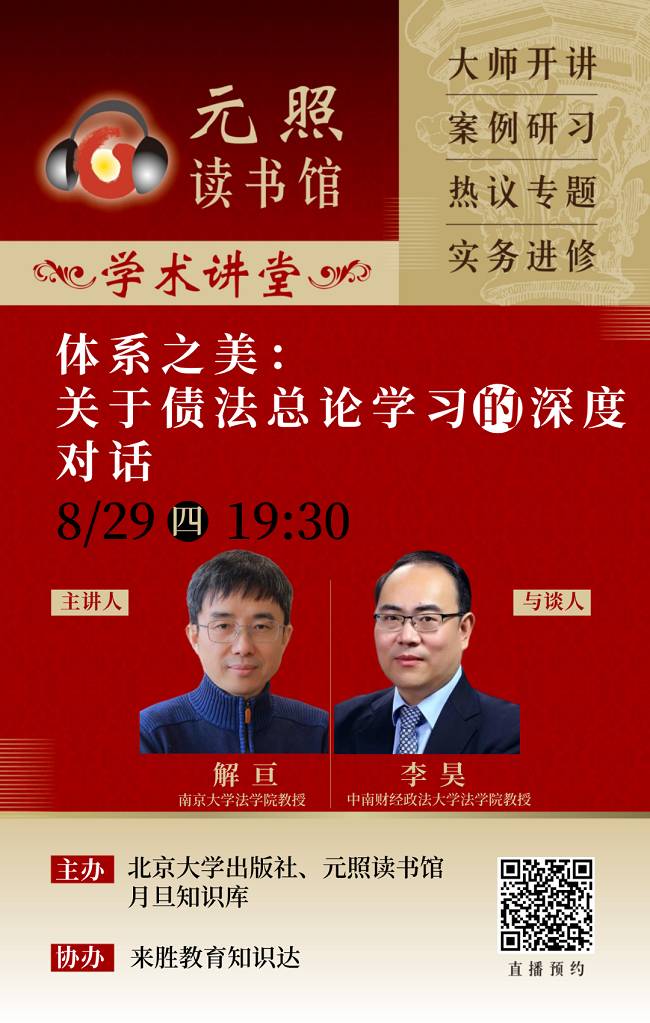 我国的《民法典》出台后,作为实证规范的“债法总则”便退出了历史舞台。尽管《民法典》在体例上并未设立债法总则,但其整体设计并未脱离潘德克吞的立法体例,依然维持着总分结构。同时,我国的法律体系也并未摒弃物债二分的传统格局。若在学理层面放弃债法总论,那么各种债之关系中具有共性的内容将在法律共同体的知识结构中失去其应有的地位。知识的准确定位是构建体系思维的关键,而体系思维恰恰是民法思维的生命力之源。因此,讲授和学习债法总论,在当前我国的法学教育中仍然具有重要的意义。8月29日19:30,南京大学法学院教授解亘老师、中南财经政法大学法学院教授李昊老师,在线分享:“体系之美:关于债法总论学习的深度对话”。本讲座以对谈的形式深度探讨债法总论课程的教与学。所涉内容将涉及:体系对于民法的意义;债法总论的功能;在《民法典》未设置债法总则之前提下债法总论的内容;学习方法;教科书的类型。
