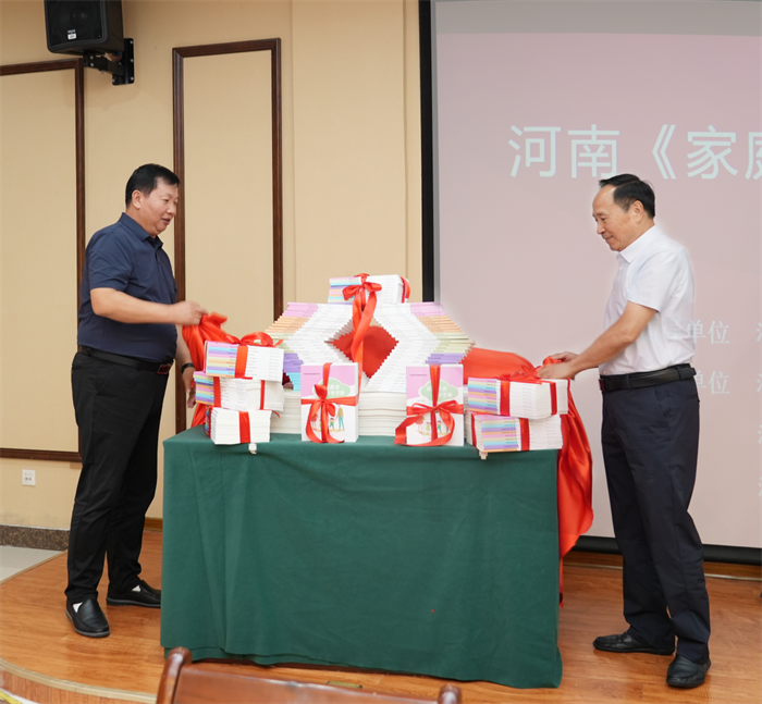 现场还举行了新书揭幕仪式和赠书活动。董丞明与谢清溪共同为《家庭教育指导手册》新书揭幕。河南省教育厅关工委副秘书长王源、河南省新华书店党委书记任振茂、河南大学出版社董事长于华龙,向河南省实验小学、河南大学附属中学、洛阳市东升第二中学三个单位赠送了新书。