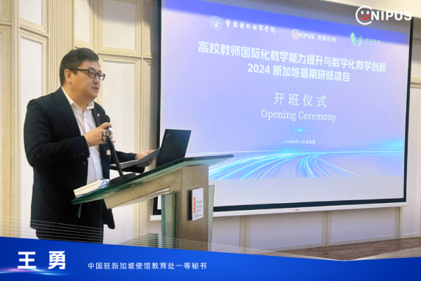 王勇代表中国驻新加坡使馆教育处致开幕辞,他充分肯定重庆对外经贸学院对国际化教学、数字化教学以及教师专业发展的重视与行动,高度评价外研在线与新加坡万和国际集团携手合作,通过举办教师国际研修等有效举措,为中新高校搭建了数字化国际化教育的国际合作交流平台。王勇鼓励参班教师深入学习了解新加坡高校在教育国际化、教育数字化转型和智慧教学模式改革方面的先进经验与实践成果,拓宽国际视野,创新数字化教学,提升数字素养与跨文化交际能力。