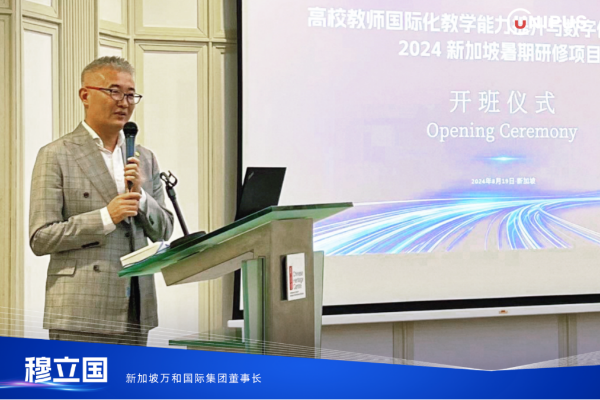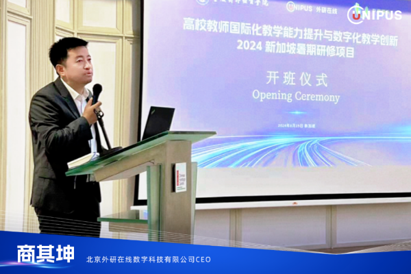 8月19日上午,“高校教师国际化教学提升与数字化教学创新”国际研修项目在南洋理工大学华裔馆正式开班。该项目由重庆对外经贸学院发起,外研在线主办,新加坡万和国际集团承办。中国驻新加坡使馆教育处一等秘书王勇、三等秘书潘辰唯、新加坡万和国际集团董事长穆立国、外研在线CEO商其坤、南洋理工大学崔峰博士,以及重庆对外经贸学院教务处长曾雪梅、外语外贸学院副院长吴耀熙、跨境商务学院副院长李艳等一行16位教师,共同出席开班仪式。开班仪式由外研在线教师发展事业总监陈静主持。