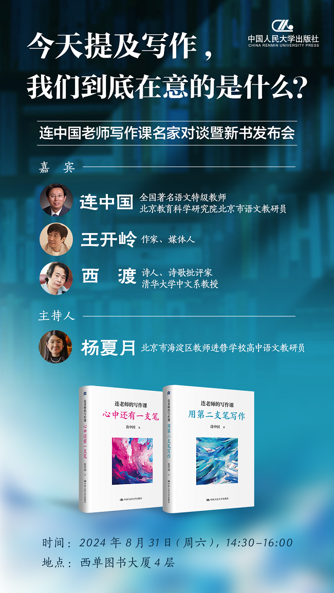 连老师的写作课正是基于连中国多年教学与指导教学的经验总结,希望能够突破学生对考场作文的迷茫,同时打破语文老师作文教学的困境,让孩子写出自己生命的发现,成为一个完整的人。2024年8月31日14:30,连中国老师将做客北京西单图书大厦,结合教学经验,与大家分享名师思路,分享语文教学尤其是作文教学的核心,与到场嘉宾著名作家王开岭、清华大学西渡教授一起畅谈写作教育的未来。