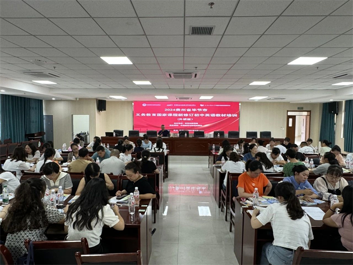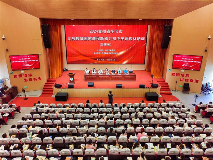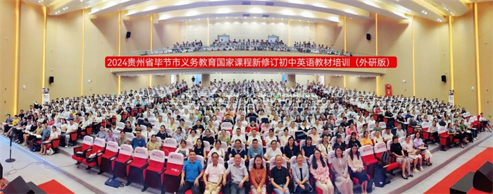 为深入贯彻落实《教育部关于印发义务教育课程方案和课程标准(2022年版)的通知》(教材〔2022〕2号)精神,助推新课标新修订教材落地实施,帮助贵州省毕节市一线教师理解《英语》(新标准)新修订教材理念和内容,将新课标的理念更好地转化为教学实践,2024年8月28-29日,由毕节市教育局主办,外语教学与研究出版社(以下简称“外研社”)承办的“2024贵州省毕节市义务教育国家课程新修订初中英语教材培训”成功召开。来自毕节市的1100余位初一英语教师通过线上(270人)和线下(850人)两种方式参加了此次培训盛会。