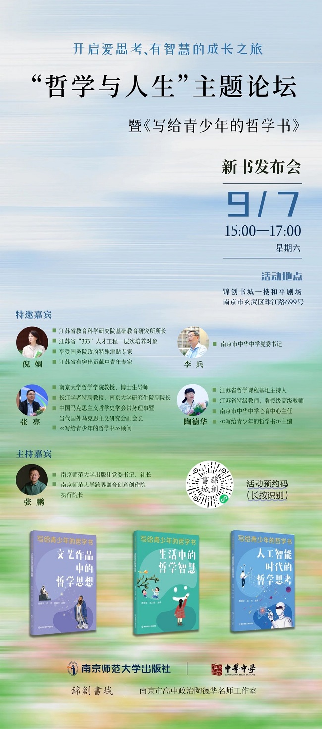 9月7日(周六)下午15:00,南京师范大学出版社携手南京市中华中学,将在锦创书城举办“哲学与人生”主题论坛暨《写给青少年的哲学书》新书发布会。现场将由基础教育专家、著名高校哲学教授等嘉宾,为您了解哲学、学习哲学、认识世界与人生提供一场精心的指导与思想的盛宴。