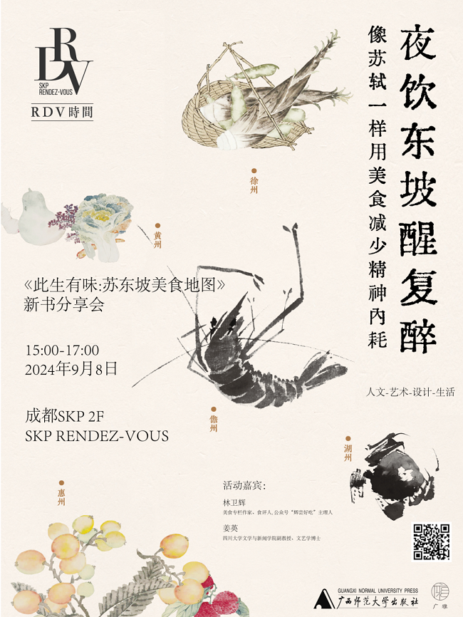 2024年9月8日(周日)15:00,本次活动特别邀请到此书的作者、美食专栏作家、《风味人间》美食顾问林卫辉与四川大学文学与新闻学院副教授姜英一起做客 成都SKP 2F SKP RENDEZ-VOUS,他们将对谈、分享此书的精彩内容,一同领略苏东坡别具滋味的吃货人生,跟随这位北宋行走的美食家,从南到北,一一尝遍中华美味,无论得意还是失意,总能在大自然中找到馈赠,竹杖芒鞋轻胜马,享受当下。