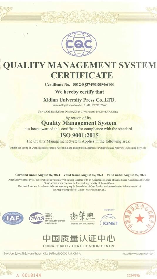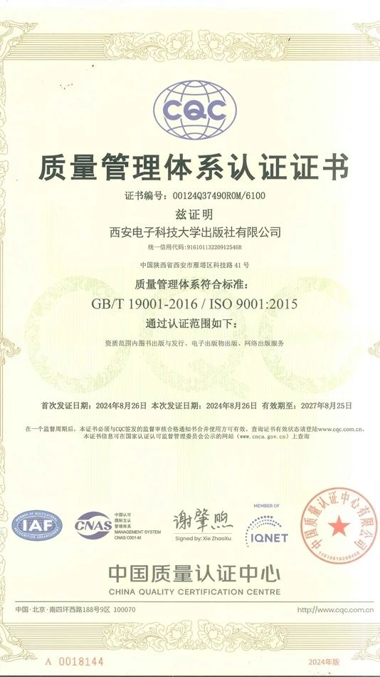 经过专题动员、专业培训和各部门协力推进,在学校领导的支持和出版社全体员工的共同努力下,经过中国质量认证中心权威专家全面、严格、细致的专业审核,西安电子科技大学出版社各项审核项目均已符合ISO管理体系标准,于2024年8月26日顺利通过国家ISO9001认证。