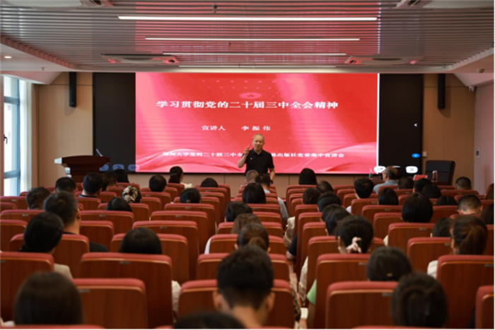 李振伟作宣讲报告。他从深入学习领会习近平总书记在党的二十届三中全会上的重要讲话精神;全面准确理解《决定》提出的进一步全面深化改革的重大举措;深化文化体制机制改革,推进物质文明建设和精神文明建设协调发展;提高党对进一步全面深化改革、推进中国式现代化的领导水平;全力以赴抓好全会精神贯彻落实等五个方面,对党的二十届三中全会精神进行了全面、深入、系统地解读和阐释。他强调,党的二十届三中全会是关键时期召开的一次十分重要的会议,是新时代新征程上推动全面深化改革向广度和深度进军的总动员、总部署。作为大学出版社,要充分认识深化文化体制机制改革的重大意义,牢牢把握深化文化体制机制改革的基本要求,不断强化主责主业,切实担负起新时代新的文化使命。