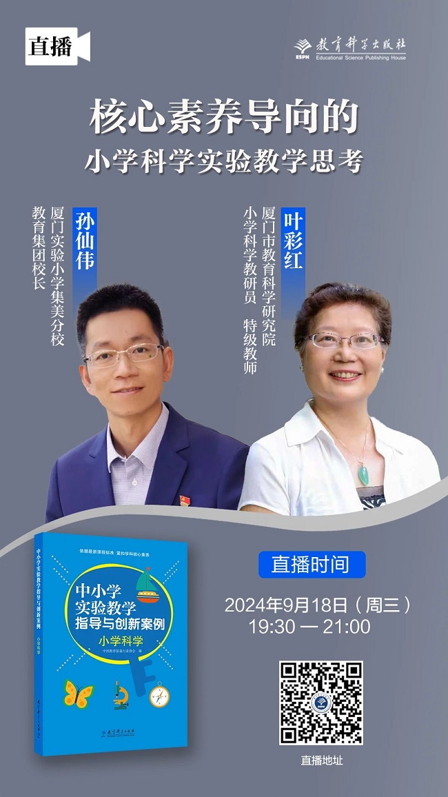 9月18日(周三)19:30—21:00,我们特别邀请到全国高级青少年科技辅导员专业水平认证专家委员会专家、厦门市教育科学研究院小学科学教研员、福建省小学科学学会副理事长、福建省特级教师、福建省小学科学学科带头人叶彩红老师以及厦门市教育学会科学教育专业委员会副秘书长、厦门市小学科学教学指导组成员、厦门实验小学集美分校教育集团校长、高级教师孙仙伟老师与读者朋友以及相关教育工作者分享他的精彩观点。