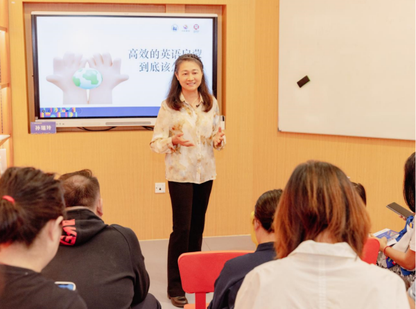 授牌仪式后,外研社分级阅读馆第一期家长课堂开启,儿童英语启蒙与早期教育专家孙瑞玲老师以“高效英语启蒙到底该怎么做”为主题,带来了一场精彩生动的讲座。孙老师从当前英语教育现状出发,以新课标、新教材为背景,深入浅出地讲解了英语早期启蒙的重要性和有效路径,并从听、激活、说、自然拼读、读、激活、写这七大步骤,拆解儿童和家长需要完成的关键任务,还指出家长不仅要做孩子的“陪伴者”,也要做孩子的“同学”和“学生”,家长们反响热烈,积极提问交流。