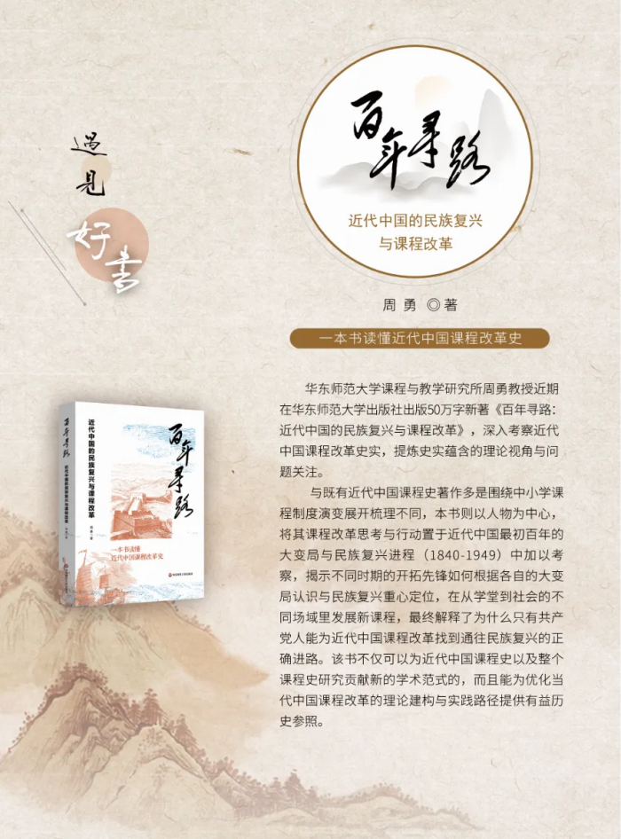 历时十余年笔耕不辍,华东师范大学课程与教学研究所周勇教授深入了解近代中国课程改革的各类相关史实,同时不断思考怎样提炼史实本身蕴含的重要理论视角与问题关注,最终完成了50多万字的教育部人文社会科学重点研究基地重大项目的结题成果《百年寻路:近代中国的民族复兴与课程改革》,目前该书已在华东师范大学出版社正式出版。