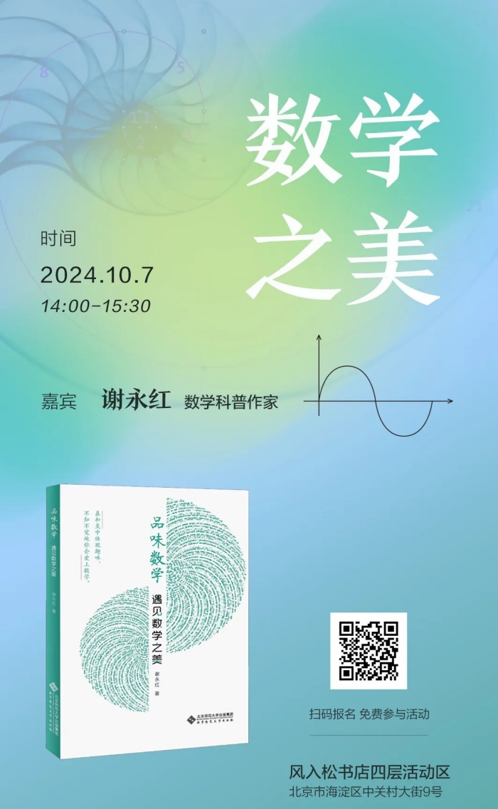 数学科普作家谢永红携《爸爸教的数学》续集、新书《品味数学:遇见数学之美》与读者线上、线下交流,探讨如何用有趣的问题、鲜活的思考探究过程,点燃青少年科学探索的激情,提升数学思维能力!