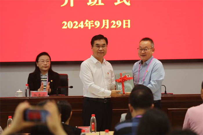 郑州大学出版社社长、总编辑、期刊中心主任卢纪富捐赠《永远的丰碑——焦裕禄画传》,王书奇代表河南焦裕禄干部学院接受捐赠并回赠《焦桐颂》。随后,王书奇为培训班授班旗,出版社第六党支部书记吕双喜代表出版社接班旗。