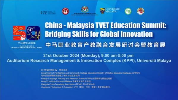 10月21-23日,由外语教学与研究出版社、马来亚大学孔子学院、马中友好协会和VTE职业教育期刊(Vocational, Technology & Education)共同主办的中马职业教育产教融合发展研讨会在马来西亚吉隆坡顺利举办。同期举办了“中国职业教育海外展系列活动之马来西亚”教育展,并开展了马来西亚当地职业院校与中资企业的参访和交流活动。本次活动是庆祝中马建交50周年的重要活动,得到了马来西亚高教部职教与社区学院司的大力支持。