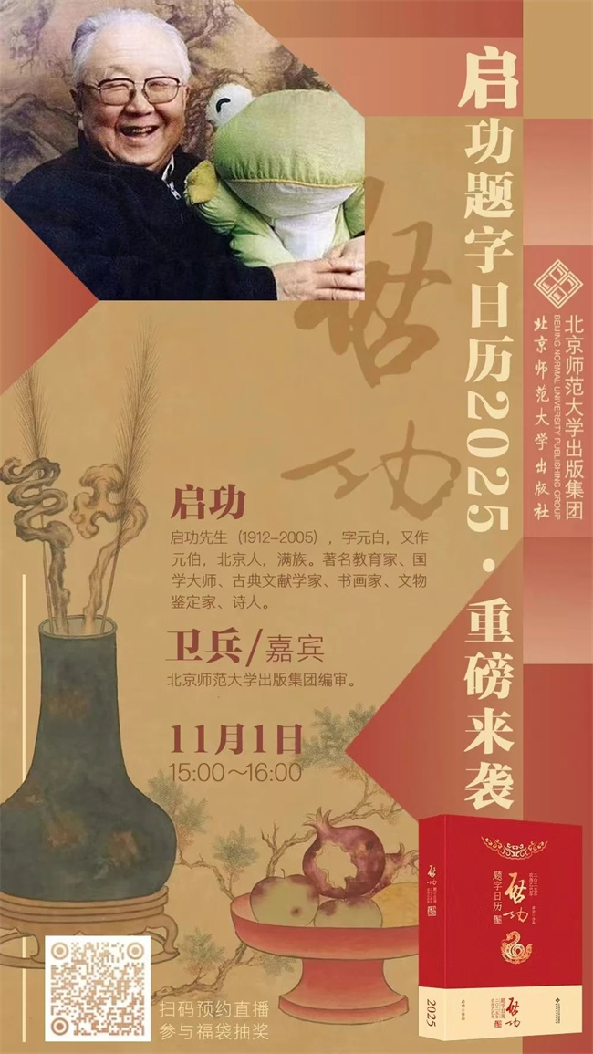 11月1日,本书编者,北京师范大学出版集团编审,民进中央开明画院理事,北京启功艺术研究会监事长卫兵老师将受邀做客直播间,与我们分享《启功题字日历2025》的点点滴滴。