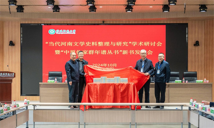 10月25日至27日,由郑州大学出版社和信阳师范大学文学院共同承办的“当代河南文学史料整理与研究”学术研讨会暨“中原作家群年谱丛书”新书发布会在信阳师范大学召开。郑州大学出版社社长、总编辑、期刊中心主任卢纪富,河南省文艺评论家协会主席孙先科,“中原作家群年谱丛书”主编徐洪军和丛书作者代表吴圣刚共同为新书揭幕。信阳师范大学校长李俊到会致辞,来自华东师范大学、首都师范大学、暨南大学、广西大学、上海师范大学、郑州大学、河南大学等省内外高校,河南日报社、《中州大学学报》编辑部等新闻出版机构的约30名专家学者参会,郑州大学出版社党委副书记、纪委书记李果,人文分社社长李勇军,人文分社副编审刘晓晓与会。