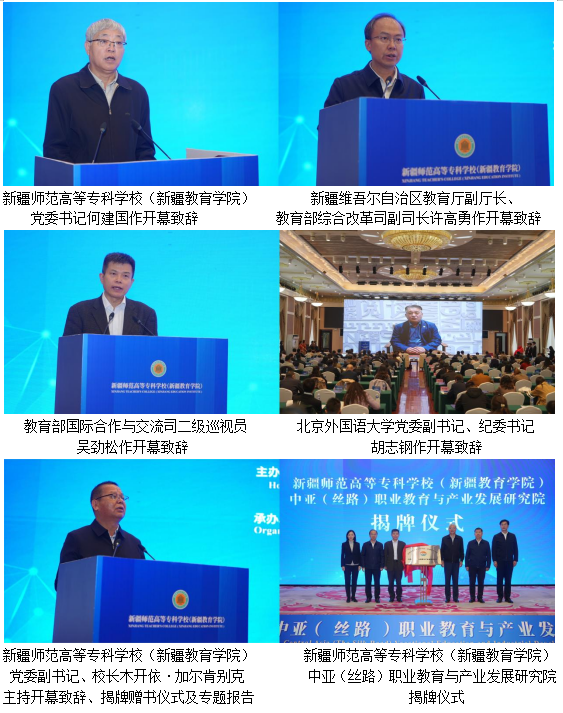 何建国表示,作为百年老校有信心做好职业教育。许高勇指出,交流研讨职业教育与产业发展的有益经验、创新思路,共同分享中外职业教育交流合作的机遇和前景,对于助力新疆打造教育对外合作战略高地、推动职业教育助力大国外交具有重要意义。吴劲松强调职业教育必须与产业发展加强紧密联系。胡志钢作视频致辞,回顾了两校帮扶合作历史,表示此次研讨会是双方创新援派工作机制、落实帮扶合作备忘的具体举措。新疆师范高等专科学校(新疆教育学院)中亚(丝路)职业教育与产业发展研究院在与会嘉宾见证下正式揭牌。