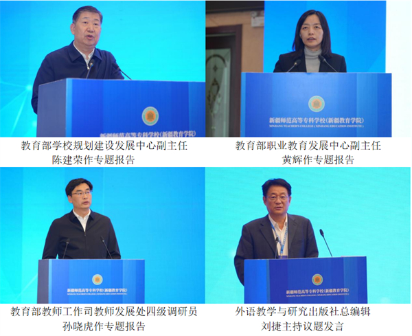 新疆维吾尔自治区教育厅副厅长、教育部综合改革司副司长许高勇,教育部国际合作与交流司二级巡视员吴劲松,教育部学校规划建设发展中心副主任陈建荣,教育部职业教育发展中心副主任黄辉,教育部教师工作司教师发展处四级调研员孙晓虎,北京外国语大学党委副书记、纪委书记胡志钢,新疆师范高等专科学校(新疆教育学院)党委书记何建国,新疆师范高等专科学校(新疆教育学院)党委副书记、校长木开依·加尔肯别克,新疆师范高等专科学校(新疆教育学院)发展规划处处长、北京外国语大学中外教育法研究中心主任姚金菊,北京外国语大学国际教育学院院长秦惠民,外语教学与研究出版社总编辑刘捷等出席开幕式。
