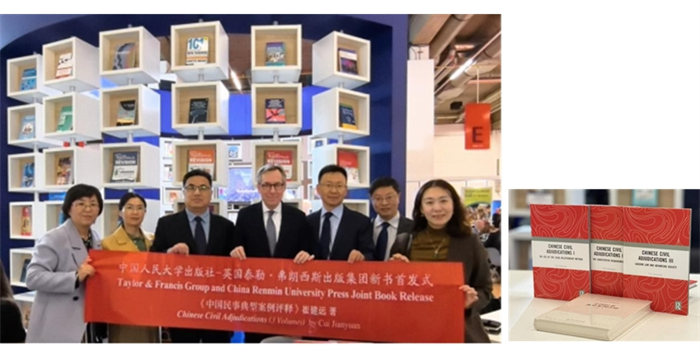 当地时间16日下午,人大出版社与泰勒·弗朗西斯出版集团召开《中国民事典型案例评释》英文版新书首发式。泰勒·弗朗西斯出版集团全球图书业务总裁贝谨立,人大出版社总编辑谢富胜、副总经理郭晓明等共同为新书揭幕。揭幕仪式后,双方围绕融合出版、人工智能对出版的影响等展开深入讨论,进一步达成了传播中国学术精品的共识。谢富胜总编辑简要介绍了人大出版社近期重点开展的业务,表示愿意与泰勒·弗朗西斯出版集团进一步拓展合作领域,共同探讨今后合作内容。人大出版社与泰勒·弗朗西斯出版集团旗下的劳特里奇(Routledge)品牌自2010年就开始了有关业务合作,截至目前,已签署《中国经济双重转型之路》《选择:中国与全球治理》《共识与秩序:中国传播思想史》等近百种学术图书的版权协议,其中70余种图书已经完成出版。