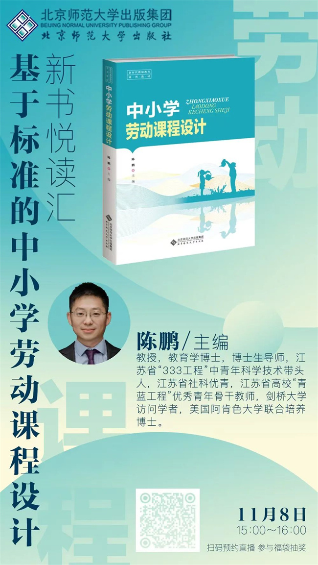 11月8日, 北京师范大学出版社将邀请本书作者,教育学博士、博士生导师,陈鹏教授做客直播间,与各位劳动教育者一起探讨中小学劳动课程设计相关内容,相信大家定能有所收获。