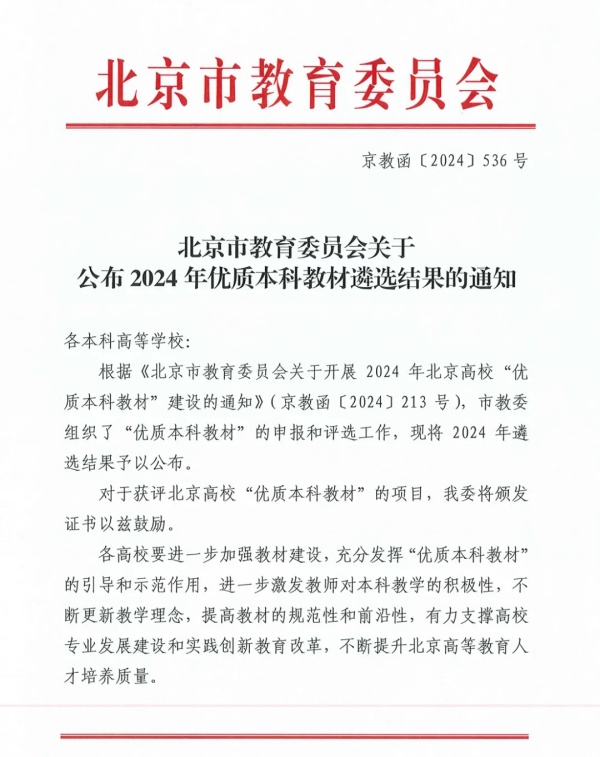 近日,北京市教育委员会公布了2024年北京高校“优质本科教材”遴选结果。北京交通大学出版社5种教材榜上有名!
