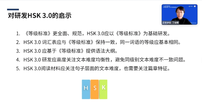 华东师范大学国际汉语文化学院常务副院长、教授丁安琪探讨了《等级标准》与HSK考试的对应关系。她基于《等级标准》与HSK2.0考试大纲等构建文本难度自动分级程序,分析了HSK阅读与《等级标准》的对应关系,并对HSK3.0阅读试题研发提出了建议。