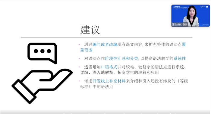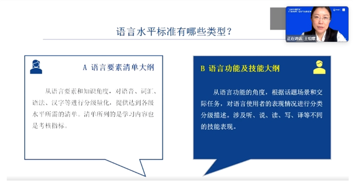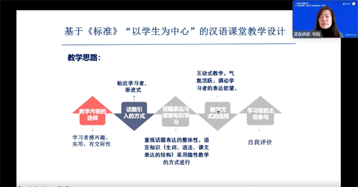 北京语言大学教授毛悦介绍了基于《等级标准》的教学设计与实施。她强调应根据现代教育理论的基本观点,按照教学目的的要求,进行系统的教学设计,注重提供真实的交际情境,结合语言要素教学与语言技能训练,采用多种教学形式以提高教学和学习效果,实现“以学习者为中心”的理念。