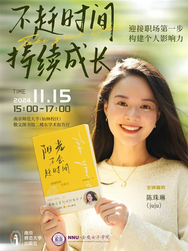 亲爱的同学们,是不是正站在校园与职场的门槛上,既满怀憧憬又略带迷茫?别担心,南京师范大学出版社将携手职场女神陈珠琳(juju),为你带来一场关于成长与蜕变的盛宴——《阳光不会赶时间》分享会!