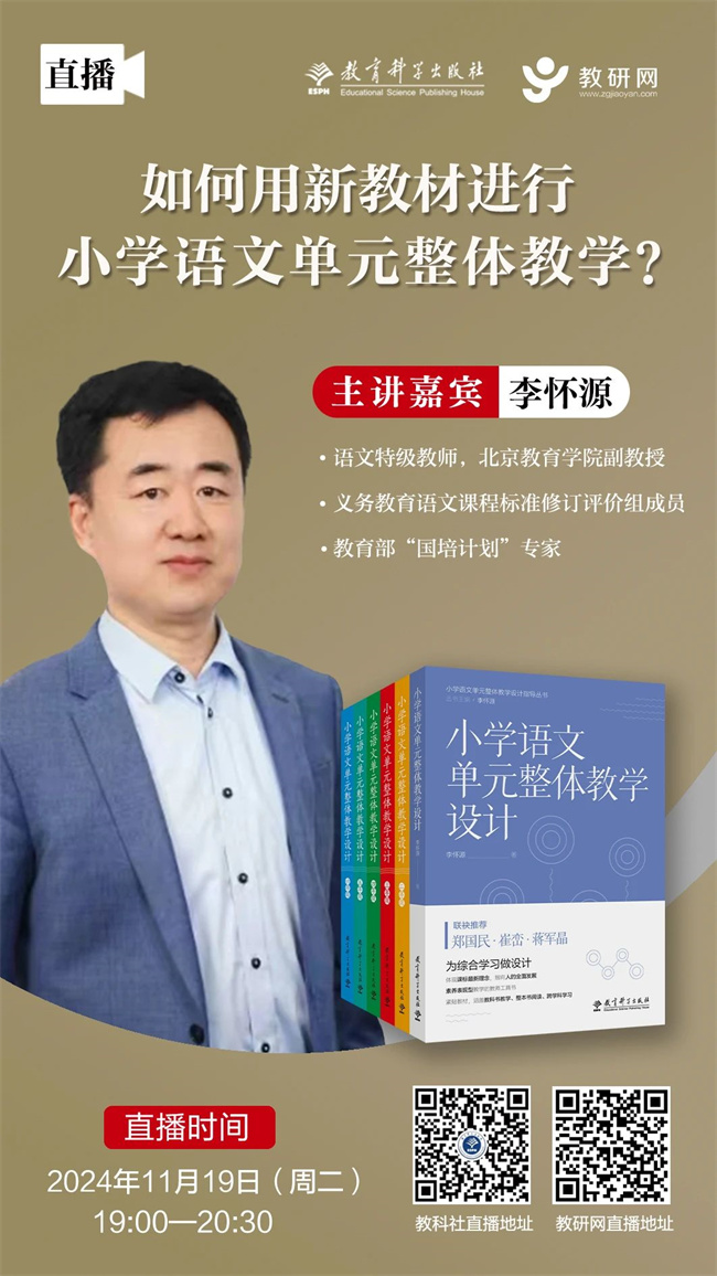 2024年秋季起,小学一年级开始使用根据《义务教育语文课程标准(2022年版)》修订的统编语文教材。新教材有了哪些变化?教学方式要有哪些变革?如何落实新课标精神,更高效地进行学习任务群设计?特级教师李怀源结合近30年一线教学经验,用单元整体教学的思路进行设计,实现了教学的优化。11月19日,教育科学出版社、教研网将联合举办“名家·名师面对面”系列活动第34期,特邀“小学语文单元整体教学设计指导丛书”主编、特级教师李怀源,围绕新教材,针对困扰老师们的疑难问题,比如如何设计单元主题、如何设计系列学习任务、如何进行评价等,用课例进行解说,提供小学语文单元整体教学解决方案,以期为广大教师更好地实践单元整体教学提供参考和借鉴。