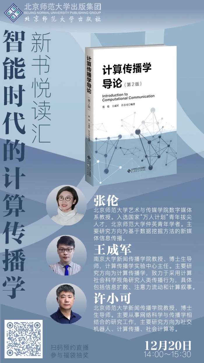 12月20日,我们将邀请本书编者,北京师范大学艺术与传媒学院数字媒体系教授张伦,南京大学新闻传播学院教授、博士生导师王成军,北京师范大学新闻传播学院教授、博士生导师许小可,与我们一同探讨计算机传播学这一前沿领域。