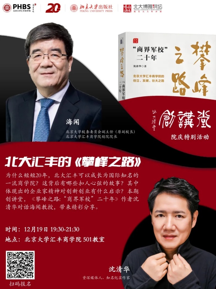 为什么短短20年,北大汇丰可以成长为国际知名的一流商学院?这背后有哪些扣人心弦的故事?其中体现出的企业家精神对创新创业有什么启示?本期创讲堂,《攀峰之路:“商界军校”二十年》作者沈清华对话海闻教授,带来精彩分享,期待您的关注!