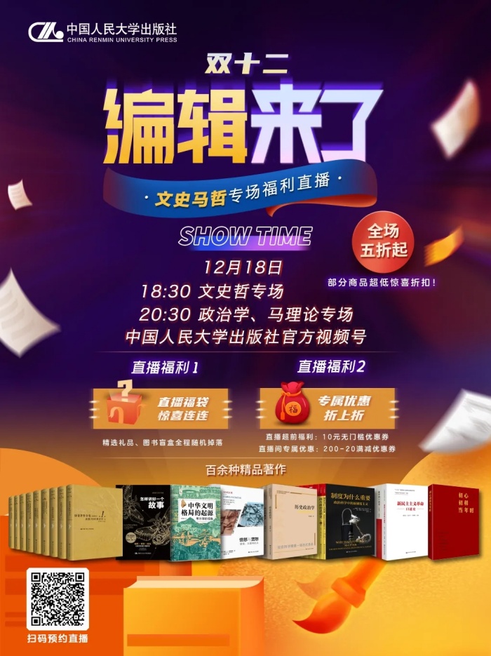 编辑入场,满载热忱。文史哲专业及政治学、马克思主义理论专业编辑携文史马哲领域百余种精品力作与您相约!“编辑来了·文史马哲专场福利直播”分上下半场,届时全场5折起并享包邮特惠!部分商品超低惊喜折扣!