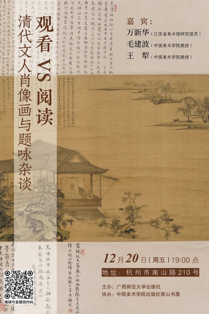 本次“湖山论艺”,由广西师范大学出版社与中国美术学院出版社南山书屋共同邀请《燕赏自娱:清代肖像画研究丛稿》的作者——江苏美术馆万新华先生联袂中国美术学院毛建波教授、中国美术学院王犁教授来南山书屋共同聊聊“观看VS阅读:清代文人肖像画与题咏杂谈”这个话题,同时,本次活动也是《燕赏自娱:清代肖像画研究丛稿》新书分享会,希望通过有意义的阐释建构出有情味的审美互动体系,从而使读者及听众更加多元化地观看、阅读、认识清代文人肖像画。