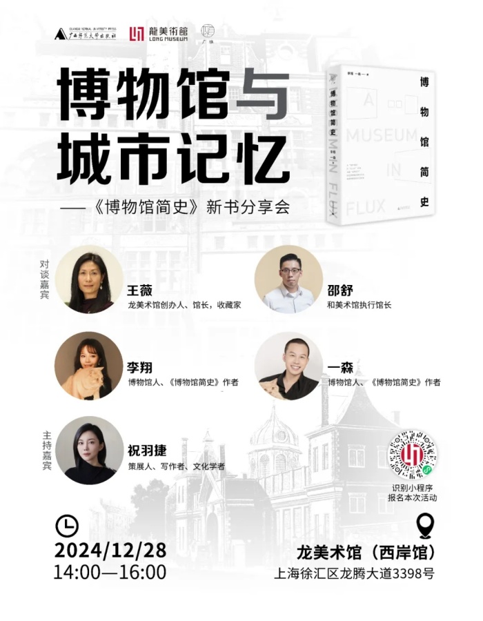 为此,龙美术馆、广西师范大学出版社借由新书《博物馆简史》,在12月28日下午14点于上海龙美术馆(西岸馆),将邀请龙美术馆馆长王薇、和美术馆执行馆长邵舒、图书作者李翔、一森以及策展人祝羽捷共同讨论“博物馆与城市记忆”,聊聊与这座美术馆发生链接,共享他们眼中的博物馆历史与记忆。