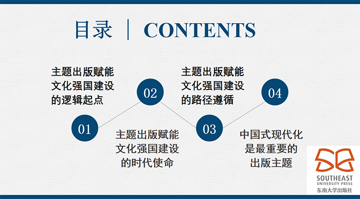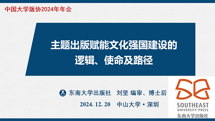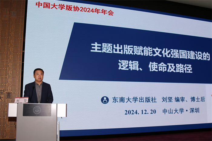 2024年12月18-21日,中国大学出版社协会2024年年会暨第37届全国大学出版社图书订货会在中山大学深圳校区举办。在编辑工作分论坛,东南大学出版社编审刘坚作题为《主题出版赋能文化强国建设的逻辑、使命及路径》的演讲。他说,主题出版是文化强国建设的逻辑起点,承载着推动文化繁荣的时代使命。在新时代背景下,主题出版需紧跟时代步伐,明确使命担当,以中国式现代化作为核心主题,探索有效路径。