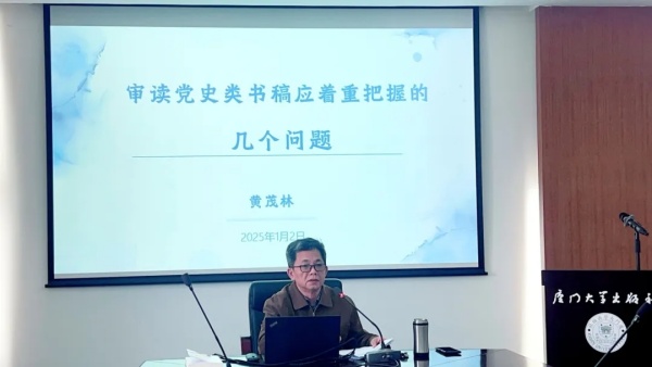 2025年1月2日,厦门大学出版社党总支邀请特聘编审黄茂林作《审读党史类书稿应着重把握的几个问题》专题讲座。此次讲座旨在持续开展党史学习教育,将理论学习与专业培训相结合,提升编校队伍的政治敏感性和专业素养,严守图书意识形态阵地。参加讲座学习的有出版社领导班子、党总支委员、党支部书记,全体编校人员。讲座由出版社党总支书记张伟主持。
