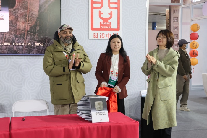 随后,中国驻尼泊尔大使馆代表宫旭、尼泊尔当代出版社社长高塔姆、浙江大学出版社总编辑陈洁教授为《何以良渚》英文(尼泊尔版)揭幕。