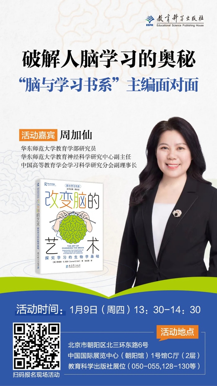 为了更好地传播科学学习的思想、普及脑科学知识,2025年1月9日下午,教育科学出版将举办“破解人脑学习的奥秘——‘脑与学习书系’主编面对面”活动。本次活动特邀“脑与学习书系”主编、华东师范大学研究员周加仙为广大读者分享脑与学习的最新研究成果,共同探讨如何让学习更加科学、高效。