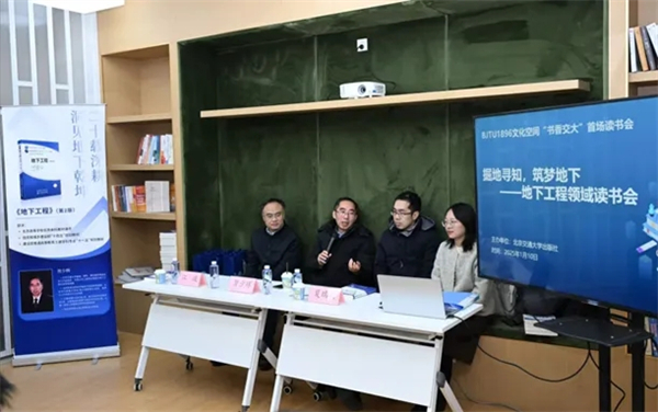 与揭幕仪式同时开启的是首场读书会,土建学院贺少辉教授新版教材《地下工程》的分享与签赠会。贺教授深入浅出地分享了教材编写的背后故事和技术前沿,吸引了众多师生积极参与。此外,来自北京城建设计发展集团和铁科院的专家夏瑞萌和江波,也带来了他们在工程项目中的实践经验,进一步激发了现场参与读书会土建学院同学们的学习热情。