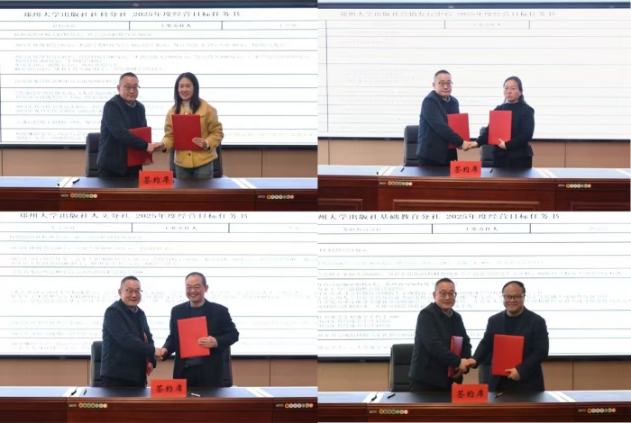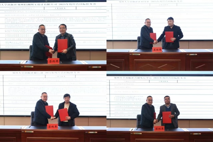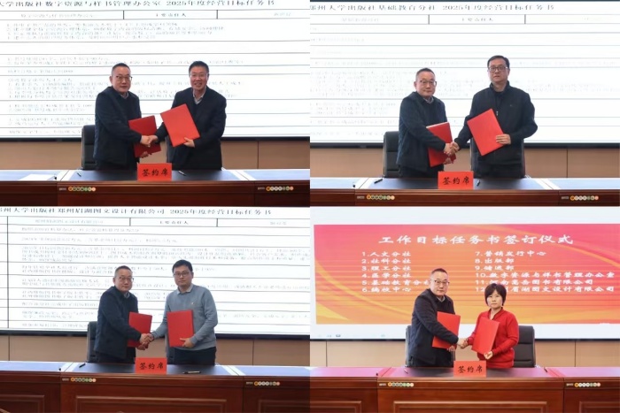 在全社员工的共同见证下,卢纪富代表出版社与人文分社、社科分社、理工分社、医学分社、基教分社、编校中心、营销发行中心、出版部、储运部、数字资源与样书管理办公室以及河南嵩岳图书有限公司、郑州眉湖图文设计有限公司2个子公司负责人签订了2025年度工作目标任务书,明确各部门2025年度主要目标和任务。