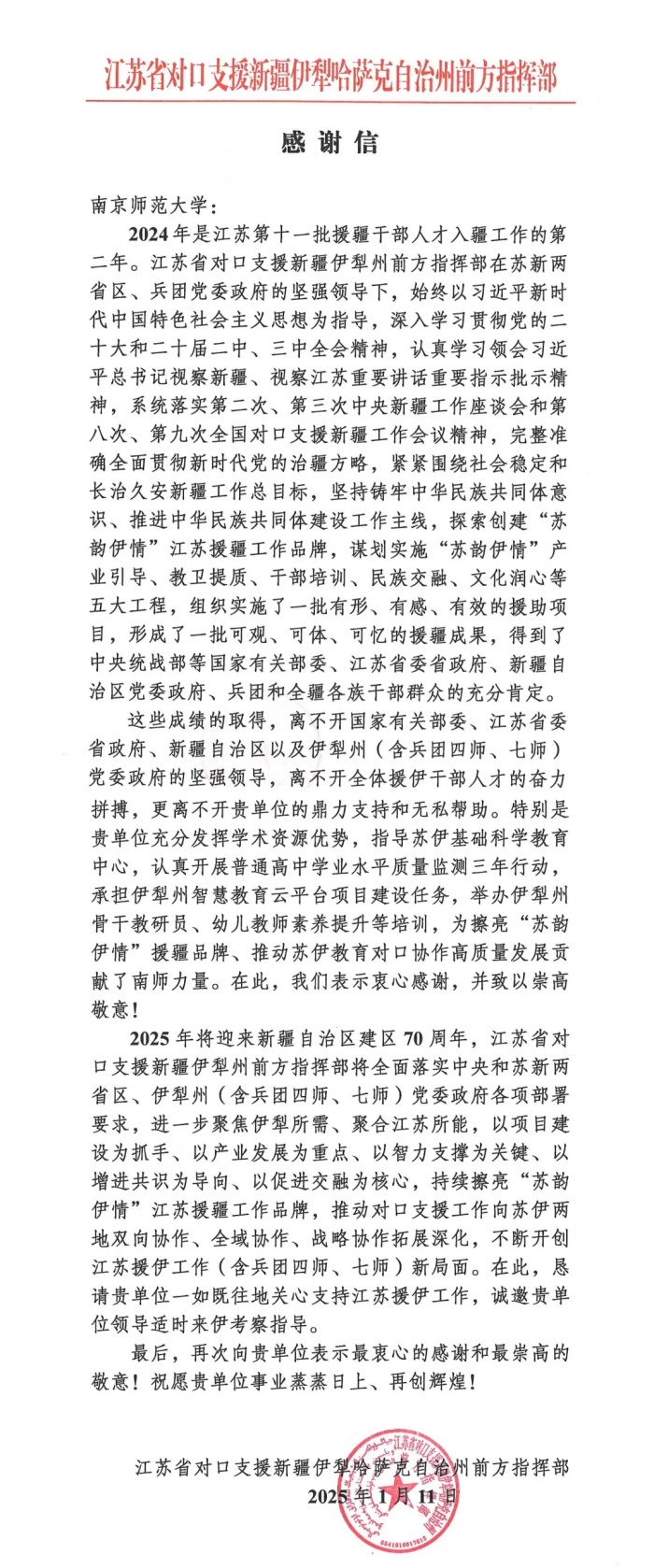 据悉,“苏韵伊情”基础科学教育发展中心项目工作专班于2023年12月在南京师范大学出版社正式设立。出版社作为南师援疆工作的重要引擎,在过去两年积极以“苏伊基础科学教育发展中心”建设为圆心,开展了各项教育援疆活动,如通过苏伊中心深入各县市、各高中学校进行调研,制定高考助力策略,以及开展文化润疆工作、主导教学评研一体化闭环体系搭建工作等。今年年初,江苏省对口支援新疆伊犁哈萨克自治州前方指挥部再次向南京师范大学发来感谢信,对南师大及出版社2024年为伊犁州基础教育高质量发展所作出的贡献,表示充分肯定与衷心感谢。