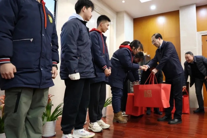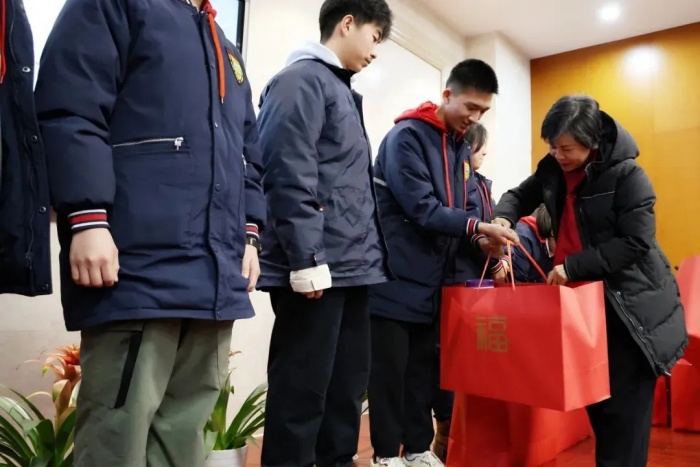 活动最后,赵庆红、顾月华、岳嵩向交流学生赠送慰问品,与会领导师生合影留念。