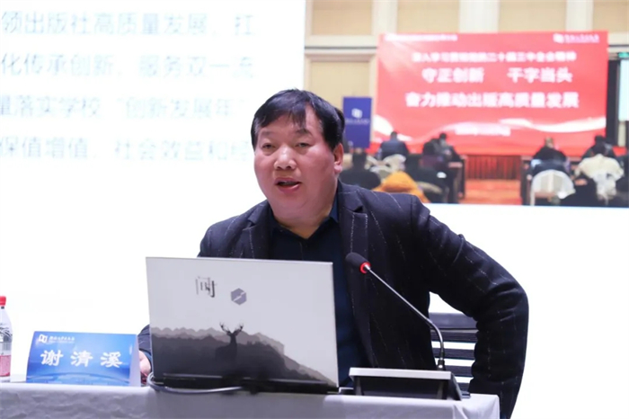 谢清溪指出,出版社2024年虽然取得较为突出的成绩,但当前发展仍面临诸多挑战。2025年是实施“倍增计划”的开局之年,出版社要继续深入学习贯彻落实习近平文化思想,坚持正确出版导向,守牢意识形态阵地,服务国家区域重大战略,服务文化传承创新,服务学校“双一流”建设,贯彻学校提出的“三个一切”原则,锚定“双效”提升的奋斗目标,在深化改革和提质增效上狠下功夫,出好书,做实事,立根本,勇创新,实改革,要效益,在党建引领、管理制度、聚焦主业、创新发展、子公司经营、图书质量、营销推广、人才队伍、文化建设、社庆活动等十大方面持续发力,创造新业绩,为顺利完成“倍增计划”开好头、打好基、提好速,努力建设一流大学出版社。
